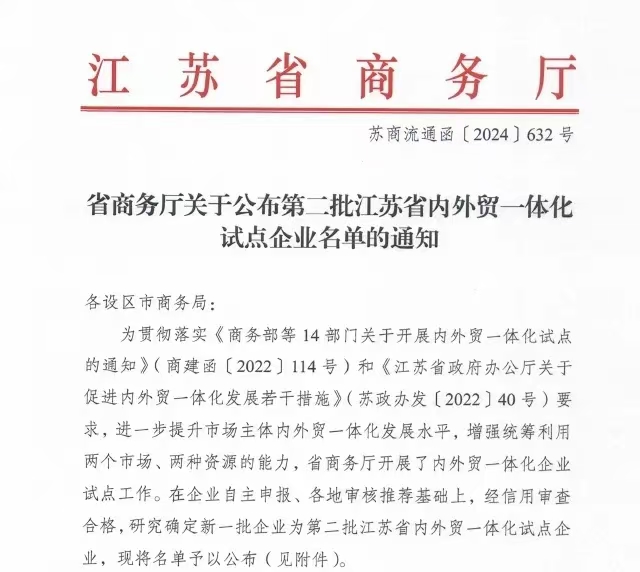 此次試點(diǎn)企業(yè)的評(píng)選,是江蘇省積極響應(yīng)國家商務(wù)部等14部門聯(lián)合發(fā)布的《關(guān)于開展內(nèi)外貿(mào)一體化試點(diǎn)的通知》(商建函〔2022〕114號(hào)),并結(jié)合《江蘇省政府辦公廳關(guān)于促進(jìn)內(nèi)外貿(mào)一體化發(fā)展若干措施》(蘇政辦發(fā)〔2022〕40號(hào))文件精神,旨在通過構(gòu)建高效聯(lián)通的內(nèi)外貿(mào)體制機(jī)制,打通內(nèi)外貿(mào)堵點(diǎn),促進(jìn)國內(nèi)國際雙循環(huán)相互促進(jìn)的新發(fā)展格局。