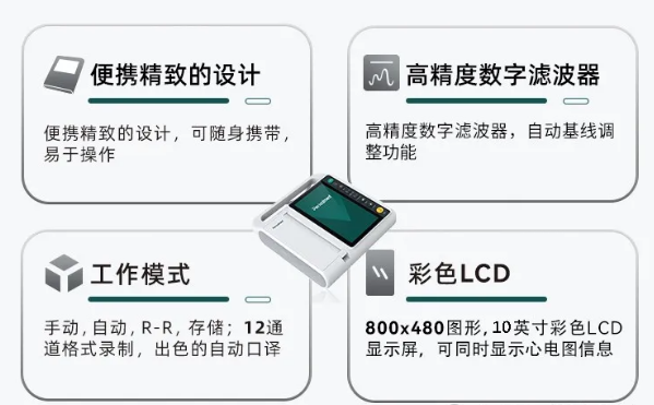 普邁思心電圖機擁有便攜精致的設(shè)計,可隨身攜帶,易于操作,精確的脈搏識別功能,高精度數(shù)字濾波器,自動基線調(diào)整,800x480圖形,10英寸彩色LCD顯示屏,可同時顯示心電圖信息。能幫助診斷各種心臟疾病,如心律失常,心肌缺血和心肌梗死。長期跟蹤病情變化,有助于醫(yī)生調(diào)整治療方式。記錄人體正常的心電活動,發(fā)現(xiàn)隱藏的心臟健康隱患。